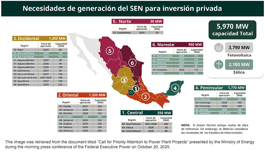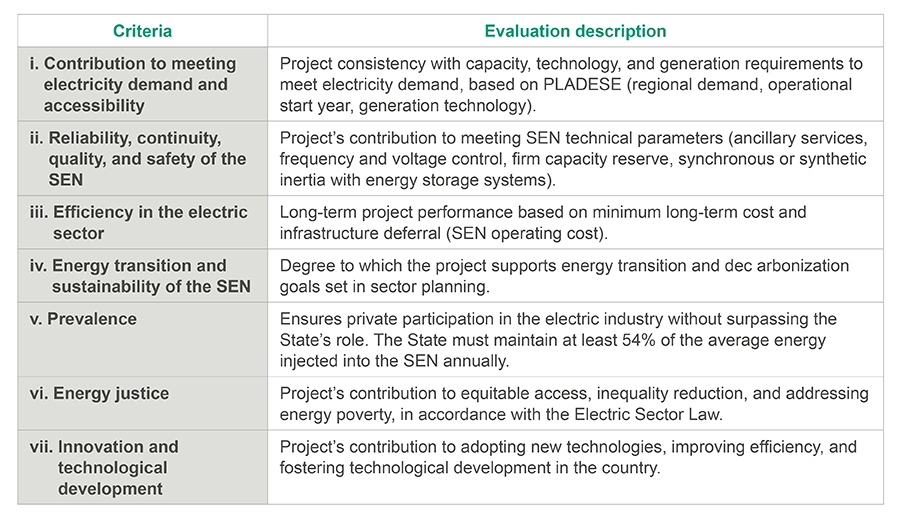 The call is open to all private entities (with or without prior application processes) interested in developing new electric generation projects with a capacity of 0.7 MW or more, intending to interconnect to the SEN and aligned with the criteria and needs identified in the binding planning outlined in the technical annex (regional control management, transmission region, interconnection substation, voltage level, and technology type).