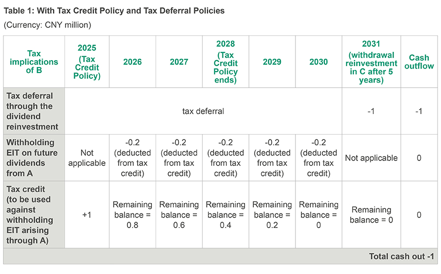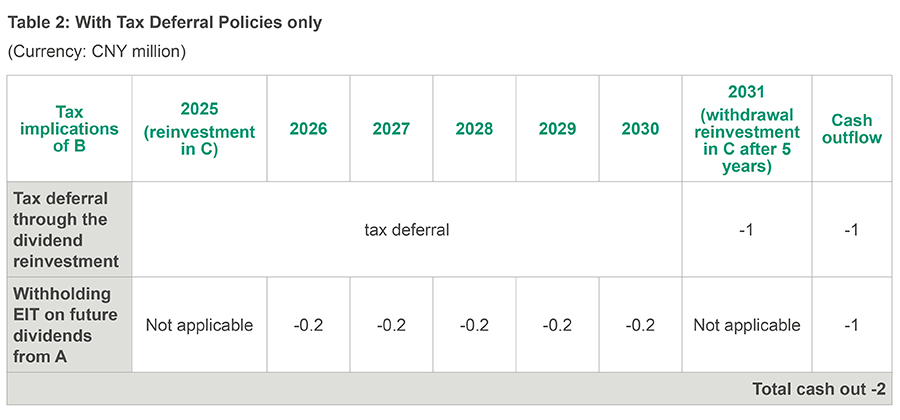 In Table 1, it can be observed that the deferred tax of CNY 1 million is paid when the reinvestment is withdrawn in 2031. However, the withholding EIT on future dividends distributed from A to B (i.e. CNY 0.2 million per year from 2026 to 2030) are not paid to the Chinese tax authority by exploiting the Tax Credit Policy. The total cashflow impact in Table 1 is CNY 1 million cash out.