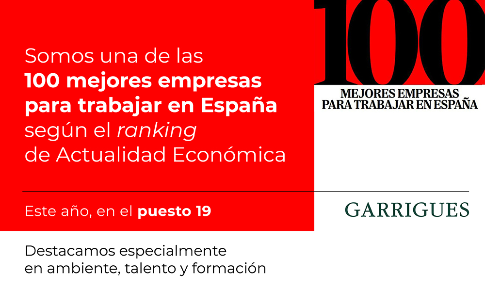 Garrigues ha sido reconocido, un año más, como una de las cien mejores empresas para trabajar en España, según el ranking de Actualidad Económica. En esta edición, el despacho se sitúa en el puesto 19, ascendiendo seis posiciones respecto al año anterior, y se consolida como el primer despacho de abogados en la clasificación. Destacan, además, sus excelentes resultados en las categorías de Ambiente, Gestión del Talento y Formación.
