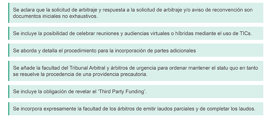 Los cambios incluidos en las nuevas Reglas de Arbitraje del CAM, expuestos en el esquema siguiente, colman lagunas y aclaran puntos controvertidos por lo que, sin duda su aplicación abonará a la eficiencia de los arbitrajes bajo estas reglas.